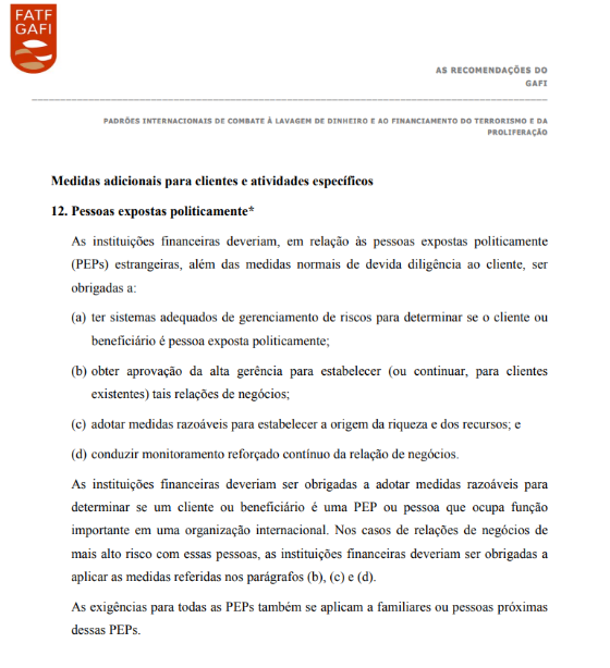 Em 1999, o Brasil foi admitido como observador no grupo e, no ano seguinte, tornou-se membro efetivo. A partir de 2003, o conceito de PEP ganhou destaque na recomendação nº 12, após uma grande revisão das normas do GAFI.